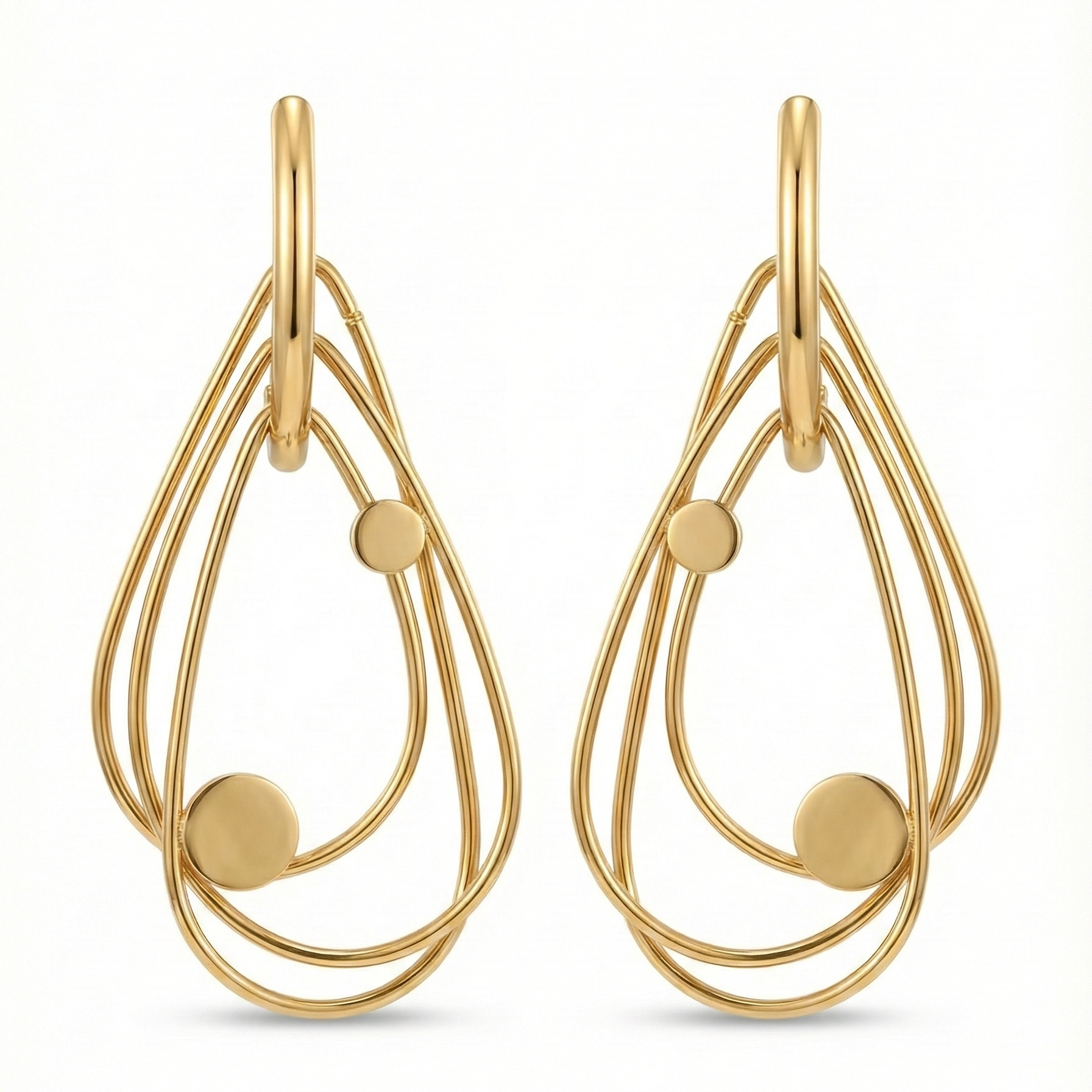 Des lignes dorées s’entrelacent, ponctuées de disques lisses, comme un équilibre subtil entre rythme et douceur.