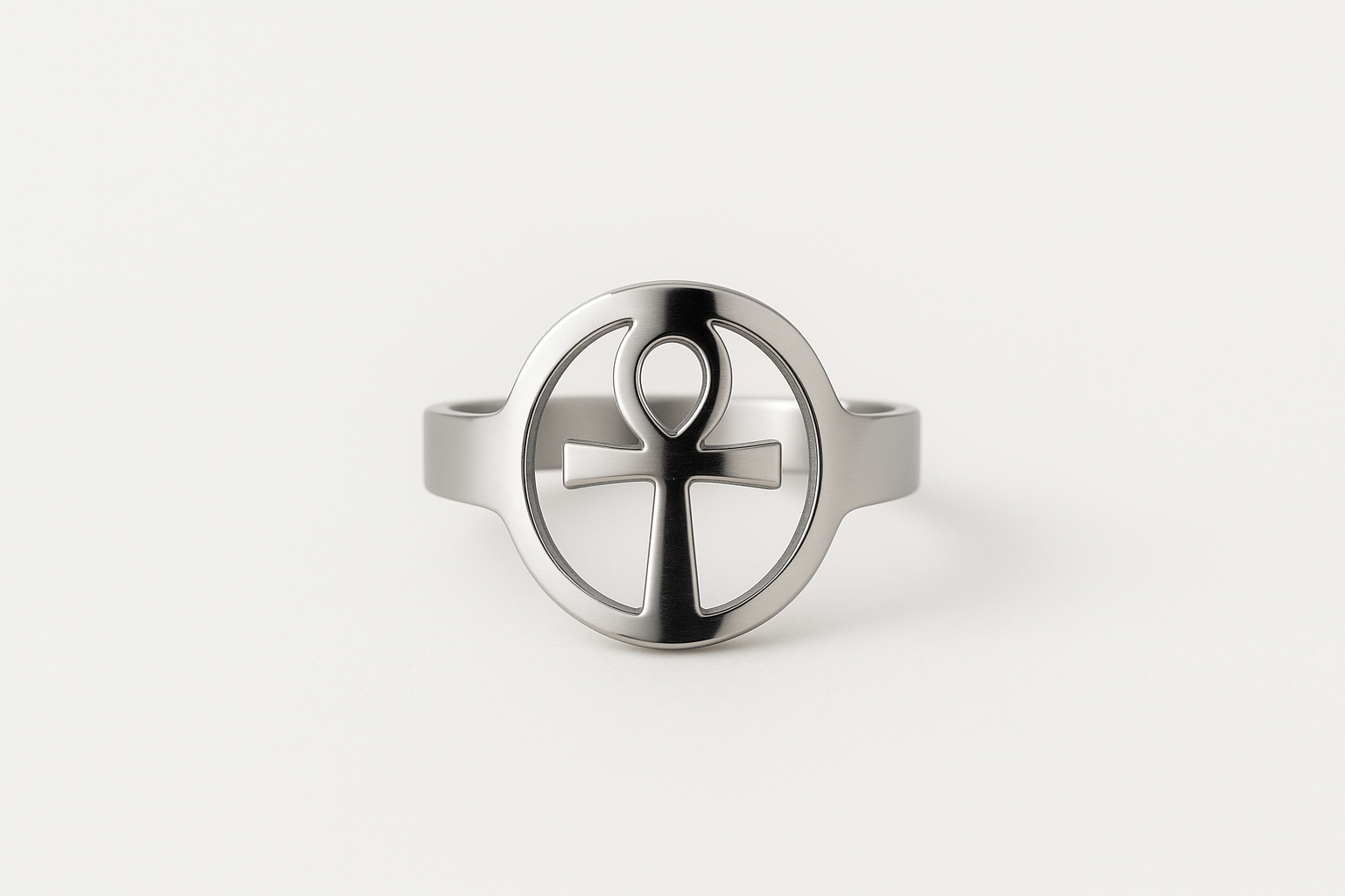 Cette bague en acier argenté met en valeur le symbole de l’Ankh, inspiré de l’héritage ancestral.