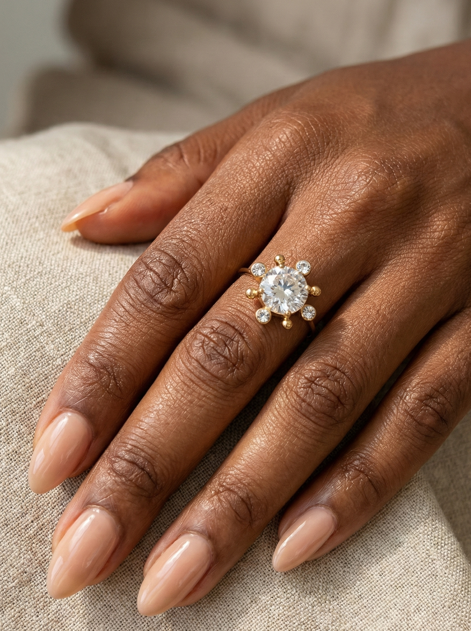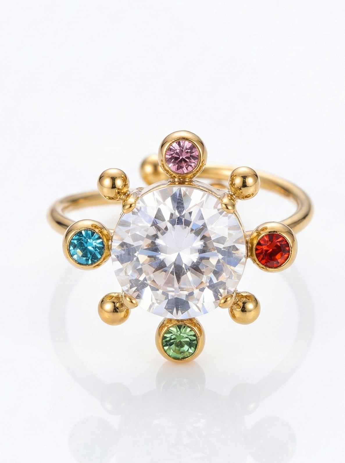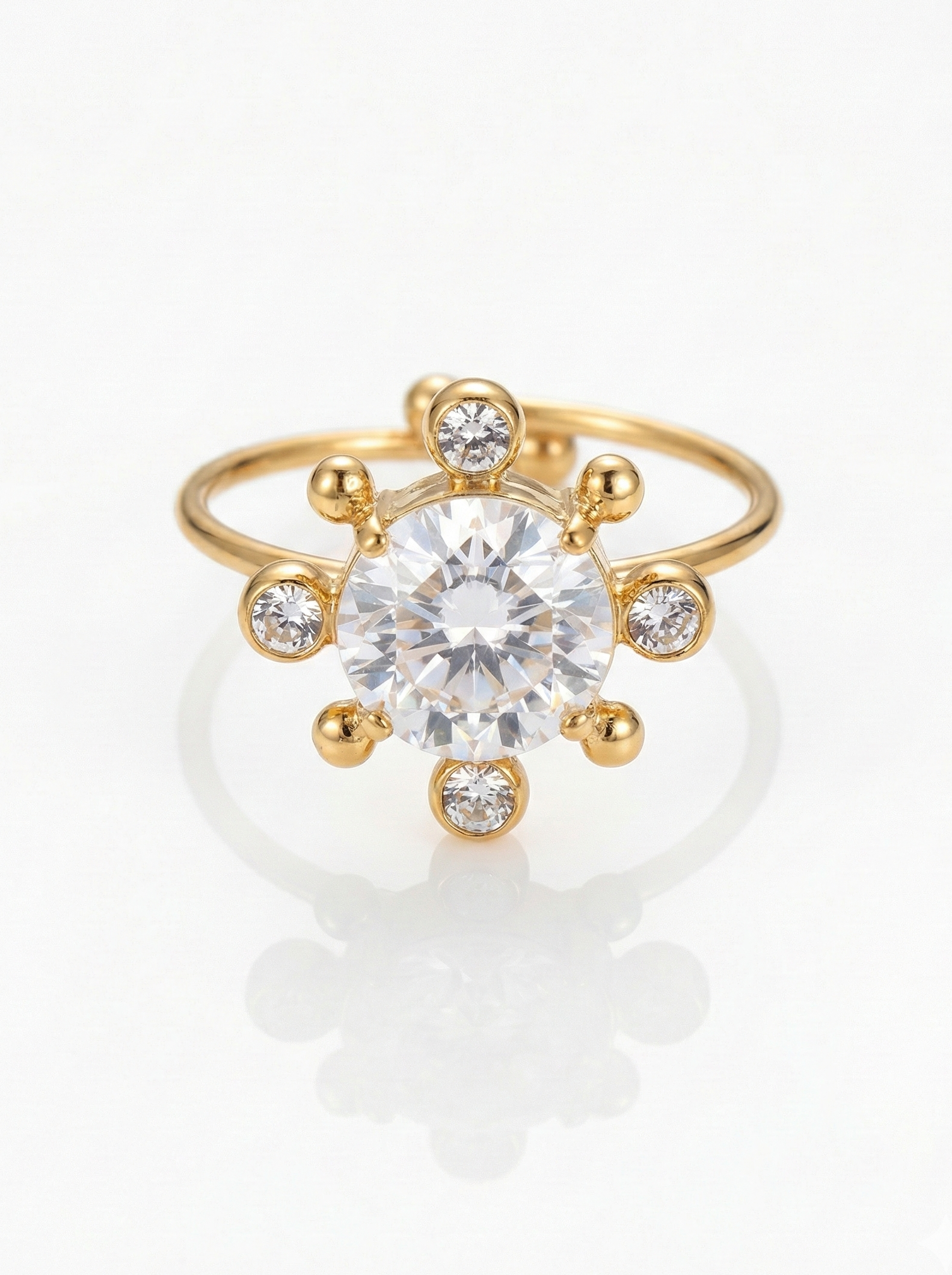 Sa pierre centrale éclatante est entourée de points sertis qui dessinent un motif rayonnant, évoquant une étoile contemporaine.