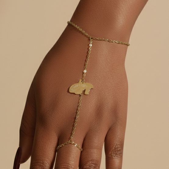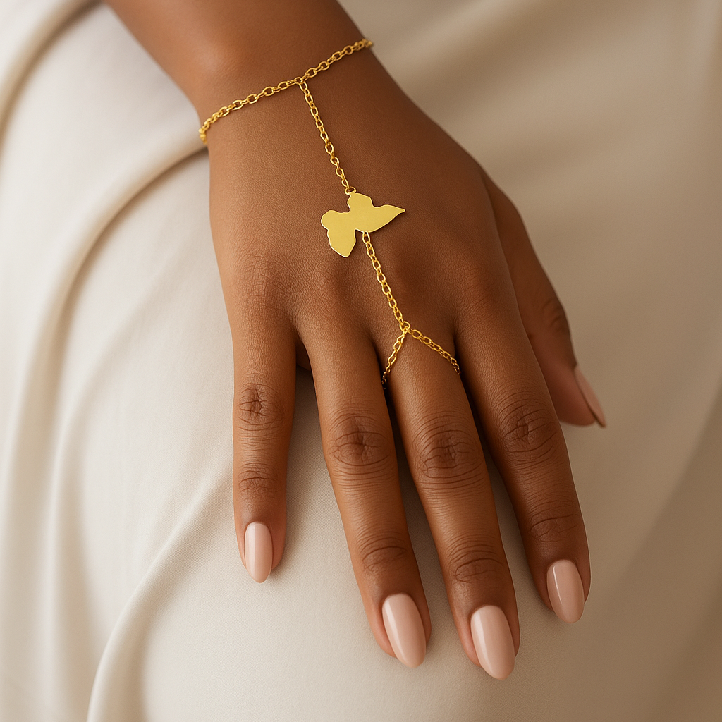 Les bijoux de main 971, 972 et 973 célèbrent les racines et la féminité à travers trois symboles forts : la Guadeloupe, la Martinique et la Guyane. De fines chaînes dorées s’unissent à des pendentifs délicats pour habiller la main d’une élégance subtile et consciente.