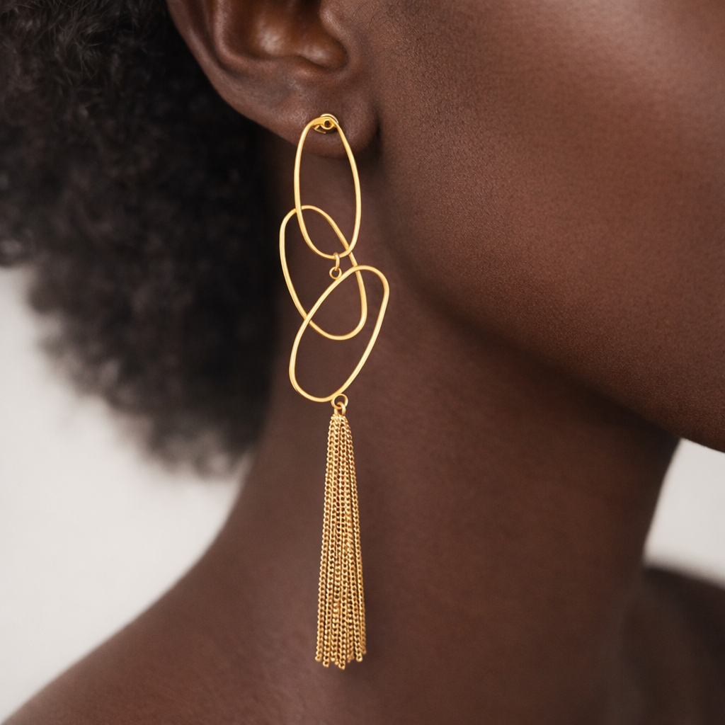 Les boucles Kinté captent la lumière à chaque geste et habillent le port de tête d’une élégance fluide et contemporaine.