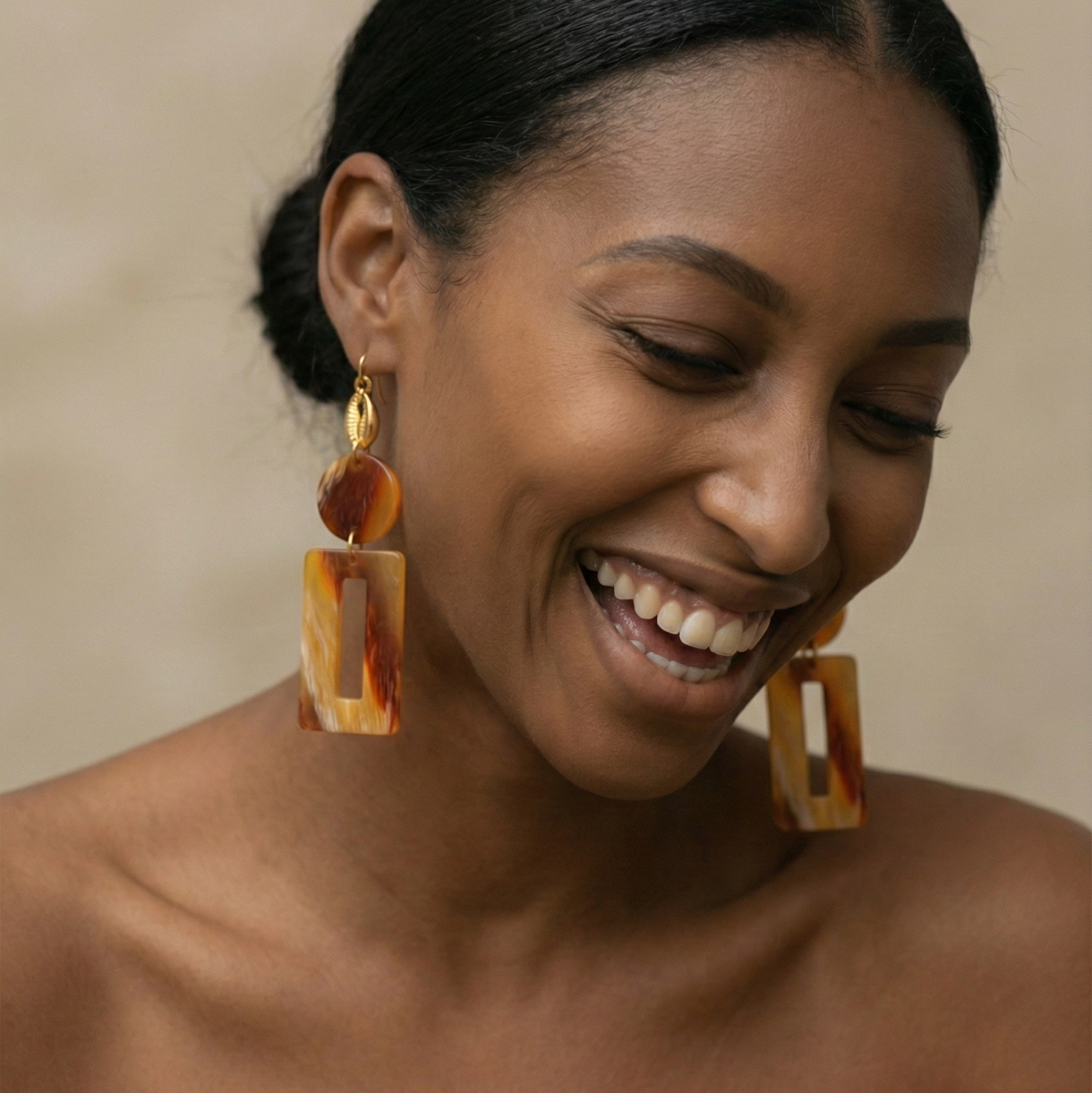 Le cauri doré apporte une touche ancestrale et la forme géométrique ouverte donne une élégance moderne, légère.